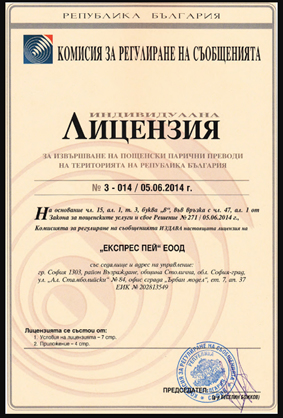 - Експрес Пей ЕООД притежава индивидуална лицензия (3-014/05.06.2014г.) от Комисията за регулиране на съобщенията (КРС) за извършване на пощенски парични преводи на територията на Република България.